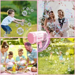 A pisztoly képes egyszerre 40 csillogó buborékot létrehozni, ami szórakoztatja a gyerekeket és a felnőtteket is.