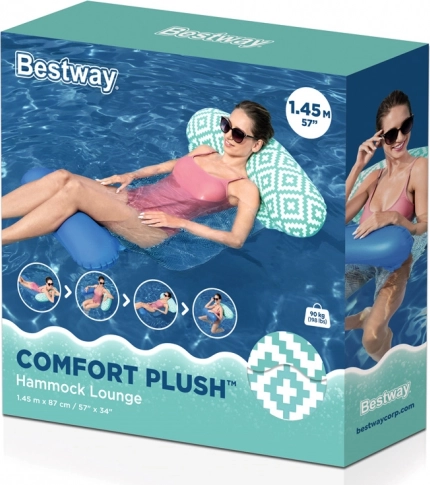 A Bestway Comfort Plush stílusos és kényelmes, vízen lebegő függőágy, amely a selymesen puha felületet légáteresztő hálóval ötvözi. A CoolDown fekvőfelület a testet közvetlenül a víztükör alatt tartja, így hőségben is kellemesen felfrissül. Víz érintkezésekor a minta színei még inkább kiemelkednek.