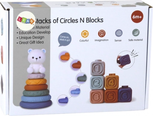 A készlet középpontjában a fehér medvés színes piramis áll, amely ösztönzi a gyermeket a szem-kéz koordináció, precíz mozdulatok és logikus gondolkodás tanulására az eltérő méretű és textúrájú karikák egymásra helyezésével.