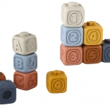 A készlet 6 puha kockát is tartalmaz, melyek számos oktatási funkciót kínálnak. Minden kocka számokat, betűket, gyümölcsök, állatok és formák képeit jeleníti meg, ami játékos formában segíti a gyermeket az alapfogalmak megismerésében és emellett támogatja a kreativitást.