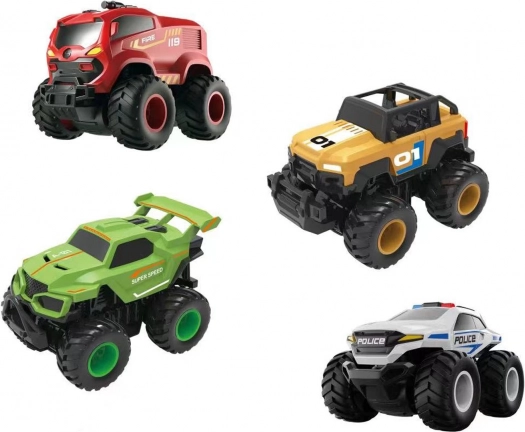Lendkerekes 13 cm-es Big Foot autó négy változatban: tűzoltó, rendőrség, zöld és sárga.