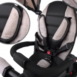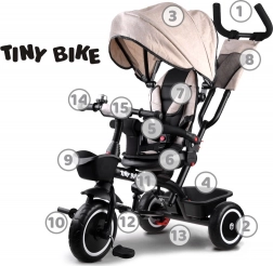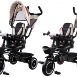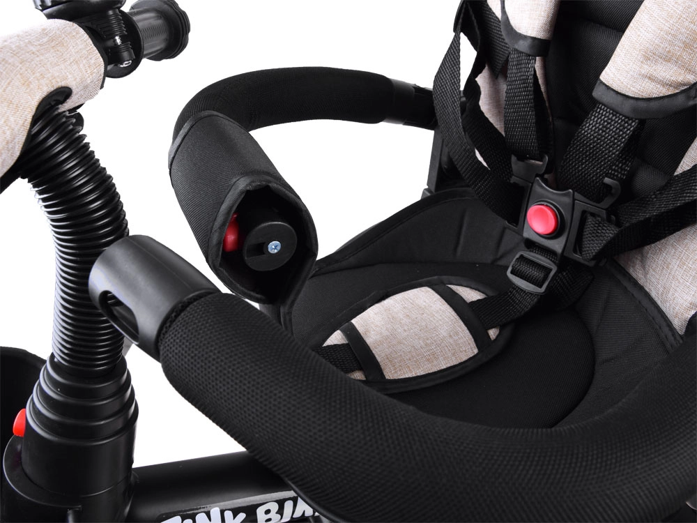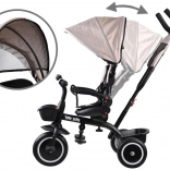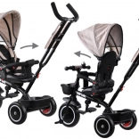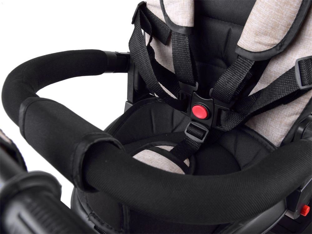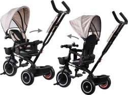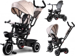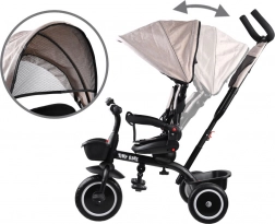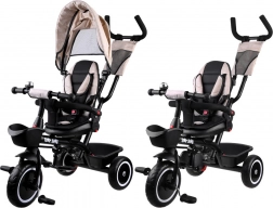 Ez a multifunkciós 3 az 1-ben tricikli ötvözi a szülői vezetésre alkalmas járművet, a kényelmes babakocsi üzemmódot és az önálló triciklit az első tekerésekhez. A forgatható ülés lehetővé teszi a szülő vagy a menetirány felé fordítást, a hálós szellőzésű napellenző véd a naptól, széltől és enyhe esőtől, és kellemes klímát biztosít. Az 5 pontos öv, a puha, levehető biztonsági karfa és az egyszerűen tisztítható, párnázott huzat gondoskodik a kényelemről és a biztonságról.
