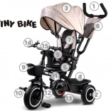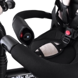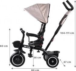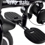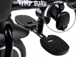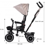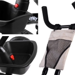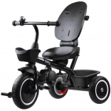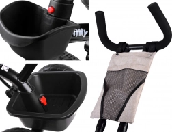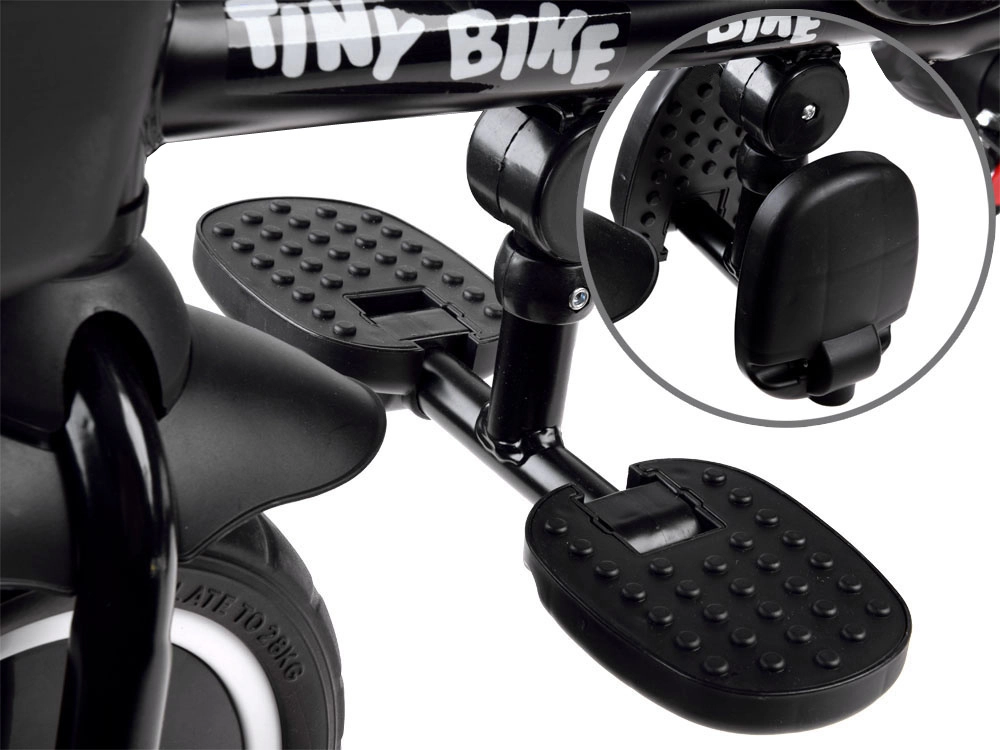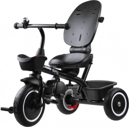 A szülők értékelni fogják az állítható tolókart kényelmes fogással, a kettős parkolófékeket a hátsó kerekeken és a praktikus tárolóhelyeket: első kosárkát, hátsó nagy kosarat és egy kis táskát apróságoknak. Az EVA habkerekek nem igényelnek felfújást, csendes és stabil haladást adnak. A lehajtható láb- és lábtartók, valamint az első kerék pedáljai megkönnyítik az üzemmódok közti váltást, így a tricikli együtt nő a gyermekkel.