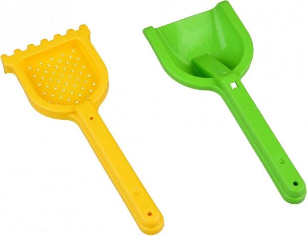 Tartalmaz gereblyét, lapátot és formákat a végtelen építéshez és alkotáshoz a homokban.