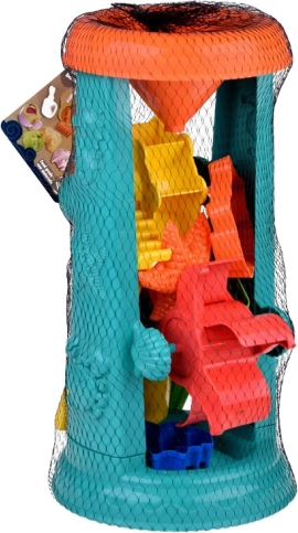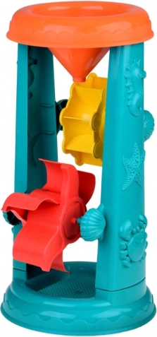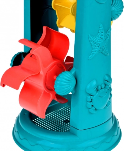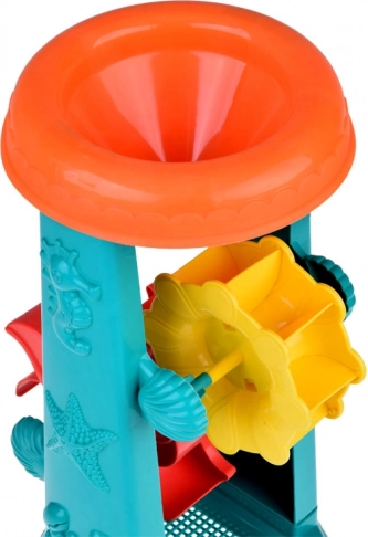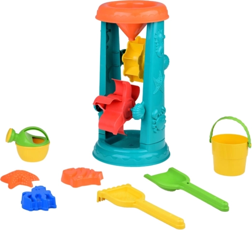 A gyerek homokozó készlet gondosan tervezett tengeri élőlény motívumokkal, mint a halacskák és polipok. A legnagyobb vonzerő a 37 centiméteres vízikerék, amelybe a gyerekek homokot szórhatnak vagy vizet önthetnek, és figyelhetik, ahogy az *ikerkerekek* forognak. Ez támogatja a logikus gondolkodás fejlesztését és az ok-okozati összefüggések megértését.