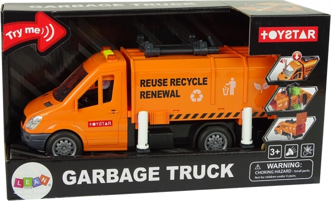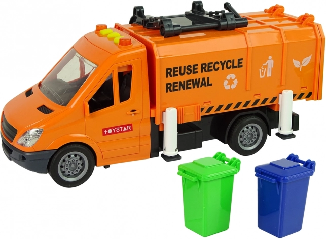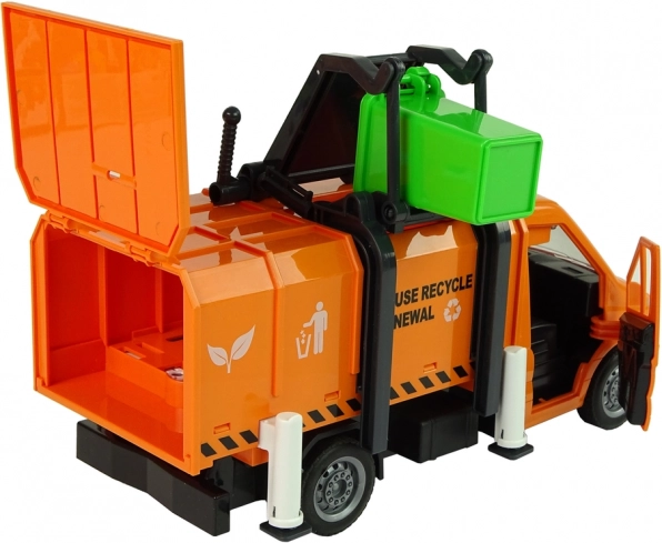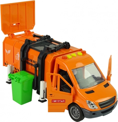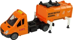 A narancssárga kukásautó hűen utánozza a valódi hulladékgyűjtő járművet, és a gyerekszobát kis újrahasznosító központtá változtatja. A súrlódásos meghajtásnak köszönhetően elég meglökni, és magától gurul. A nyitható konténer megkönnyíti a „szemét” kiürítését, míg az oldalsó emelő a kukák tartalmát közvetlenül a felépítménybe önti.