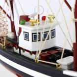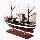 Ez a fa gyűjtői modell tökéletesen visszaadja a tengeri világ hangulatát. A sötétkék szín fehér csíkokkal és a feltűnő orrdísz klasszikus, autentikus megjelenést teremt. A precízen készített árbócok hálóval és a gondosan kidolgozott navigációs kabin kiemelik a kézműves minőséget.