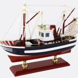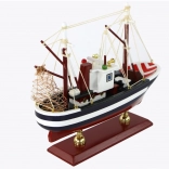 Elegáns fa halászhajó‑modell részletgazdagon kidolgozott magas árbócokkal, élethű halászhálóval és dudákkal, figyelmeztető fényekkel felszerelt kabinnal. A kék kivitel fehér csíkokkal és a jellegzetes fehér‑piros orrdísszel időtálló hatást kelt. A stabil fa lábak biztosítják a biztonságos kihelyezést polcra vagy asztalra. Ideális ajándékdekoráció tengerkedvelőknek és gyűjtőknek.