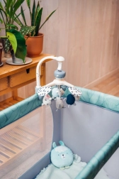 A csomag részei a puha szenzoros játékok minőségi textíliákból (bársony, filc), susogó és sípoló elemekkel. A játékok könnyen levehetők, önállóan is használhatók, illetve mosógépben moshatók. A lassú forgás támogatja a vizuális észlelést és a baba koncentrációját.