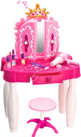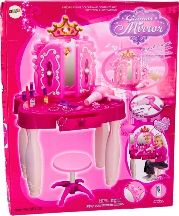 Engedje, hogy gyermeke belépjen a fantázia világába egy fésülködőasztallal, melynek tükre egy varázspálca suhintására felragyog, és melódiákkal és villogó fényekkel kíséri a játékot. A MP3 bemenetnek köszönhetően sminkelés és frizurakészítés közben is szólhat a kedvenc zene.