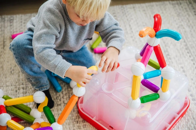A 100 darab mágneses építőelemet tartalmazó SmartMax konténer ideális gyönyörű, nagy építmények megalkotásához. Ez a mágneses építőkészlet tökéletes játék már 1 éves kortól. Ebből a szettből a gyerekek csodás építményeket, hidakat stb. hozhatnak létre. Ideális játszósarkokba és óvodákba is. Az építőkészlet praktikus konténerben van elhelyezve. A konténer piros fedele és alja egyben építési alaplapként is szolgál.