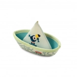 Okos zuhany funkció: fordítsd a csónakot fejjel lefelé, töltsd meg vízzel, és figyeld, ahogy a „vitorla” nyílásain gyengéden átfolyik. Ez motivál a felfedezésre, fejleszti a finommotorikát és az érzékelést.