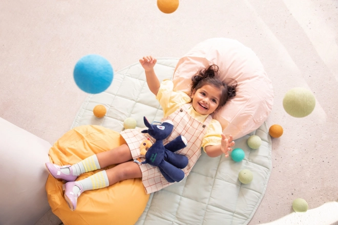 A játék minőségi poliészterből és pamutból készült, kellemes tapintású textúrái taktilis stimulációt nyújtanak, és ideálisak ölelgetéshez otthon és útközben egyaránt. A tisztítás egyszerű – elég nedves ruhával áttörölni a felületet.