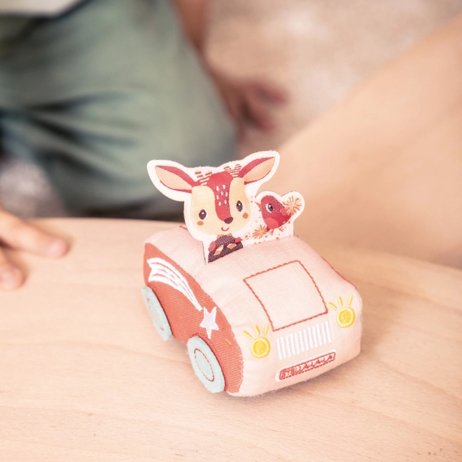 A puha kisautót Stella, az őzgida és Robin, a madár díszítik, akik játékosságot és vonzerőt kölcsönöznek a játéknak.