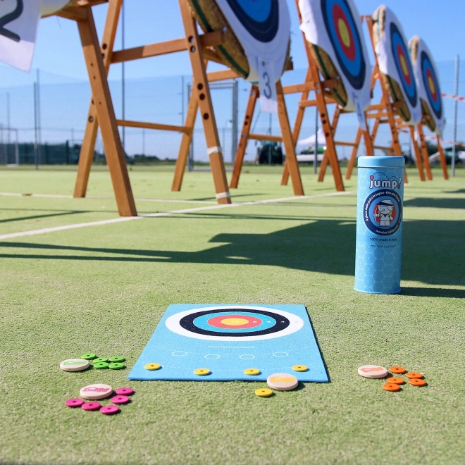 A Jump! Íjászat egy magával ragadó családi játék, amelyben a játékosok fa zsetonokat „lőnek” a cél felé, és a legmagasabb pontszámért versenyeznek. Válassza ki a zsetonok színét, határozza meg a kezdővonalat – közelebb a pontosságért vagy távolabb a nagyobb kihívásért – és mutassa meg ügyességét.