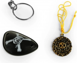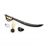 A szablya mellett szemfedőt, zsinóron hordható medált és fülkarikát is kapsz – mindent, ami az autentikus kalóz megjelenéshez kell, egy pillanat alatt.