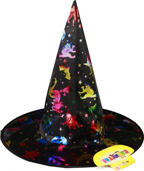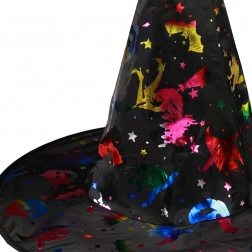 Készülj fel a Halloweenre vagy tematikus bulikra ezzel a varázskalappal. A kalap fekete holografikus mintákkal van ellátva, amelyek denevéreket és csillagokat ábrázolnak, ideális mindenkinek, aki különleges megjelenést szeretne.