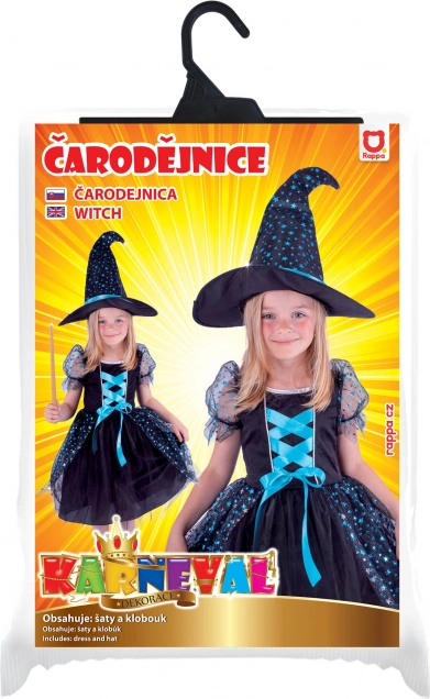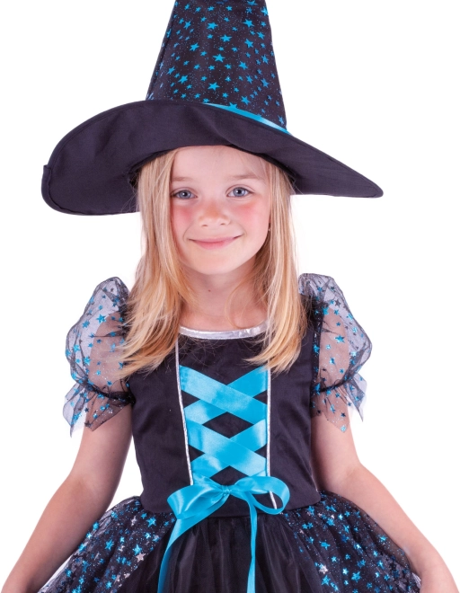 Elbűvölő gyerek boszorkányjelmez kék-fekete kivitelben, amely minden kis varázslót a buli sztárjává varázsol. A ruha metálfényű csillagokkal csillog, türkiz szalag díszíti, és természetesen a hozzá illő boszorkánysüveg sem hiányzik. Ideális farsangra, Halloweenre és mesés jelmezes játékokra is.