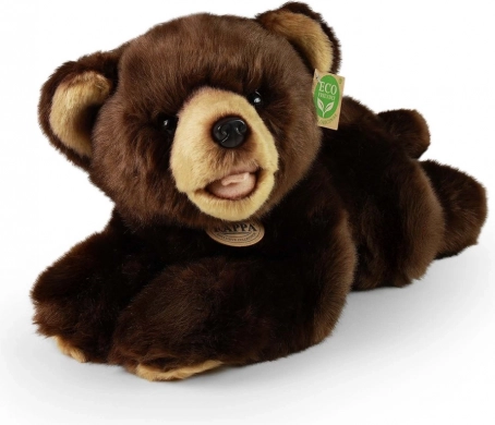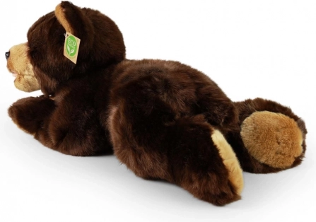 A 32 cm-es, aranyos fekvő plüss mackó puha felületével és minőségi kivitelével örömet szerez. Újrahasznosított PET-palackokból készült, környezetbarát töltete biztonságos még a legkisebbeknek is, szuperpuha ölelgetéshez, és közben kíméletes a természethez. Élethű kivitele és kézi megmunkálása ideális ajándékká teszi gyerekeknek, illetve dekorációként a gyerekszobába.