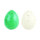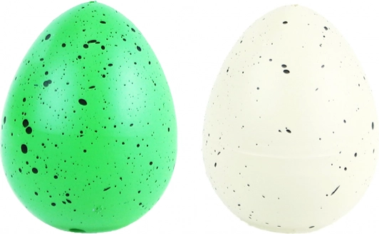 Minden tojás egyedi zöld, fekete foltokkal és egy sokszínű dinoszauruszt rejt.