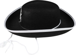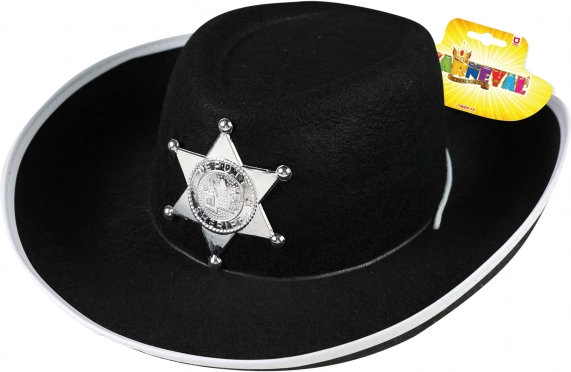 Add meg a kis cowboy jelmeznek az autentikus megjelenést! Ezt az elegáns fekete gyerek cowboykalapot feltűnő seriffcsillag és körben fehér szegély díszíti, ami stílusos kontrasztot ad. Az áll alatti zsinór gondoskodik róla, hogy a kalap jól tartson még önfeledt játék közben is.