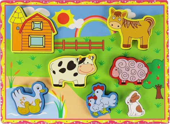A fa kirakó farm állatkákkal remek eszköz gyermeke motoros képességeinek fejlesztésére. Ezzel a játékkal a gyerekek megtanulják felismerni az alakzatokat és állatokat. Továbbá:
