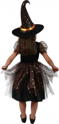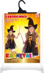 A fekete jelmez narancssárga szalagokkal és fémes csillagokkal stílusos megjelenést kölcsönöz minden kis boszorkánynak.