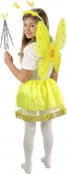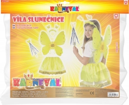 A ragyogó sárga napraforgó jelmez első pillantásra magára vonja a figyelmet – a csillogó részletek, a finom kövecskék és a szárnyak közepén lévő virág varázslatos megjelenést adnak. A habos szoknya alul arany flitterekkel szegélyezett, így minden mozdulatnál szépen csillog.