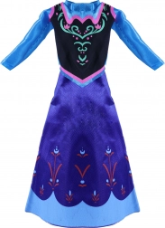 A ruha kék és lila színekben pompázik, bonyolult virágmintákkal.
