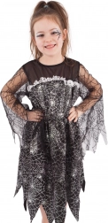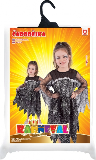 Elbűvölő gyerek boszorkányjelmez kislányoknak 6–8 éveseknek (117–128 cm), amely a farsangon és Halloweenkor is ragyog. A fekete ruha ezüst pókhálómintával, hálós ujjakkal és cakkos szegéllyel könnyen felvehető, és látványos, titokzatos megjelenést biztosít. Seprű és varázspálca nem tartozék.