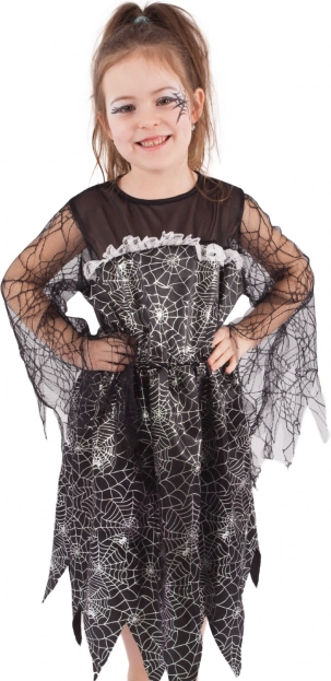 Tegye a kis boszorkányt az est sztárjává. Az elegáns fekete ruha ezüst pókhálómintás nyomattal, áttetsző hálós ujjakkal és látványos, cakkos szegéllyel tökéletesen hátborzongató, mégis bájos megjelenést nyújt Halloweenre, farsangra és tematikus partikra.