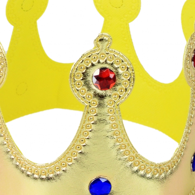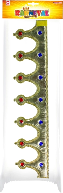 Karneváli királyi korona, szövetből, kövekkel díszítve. Tépőzáras. Hossza kb. 53 cm.