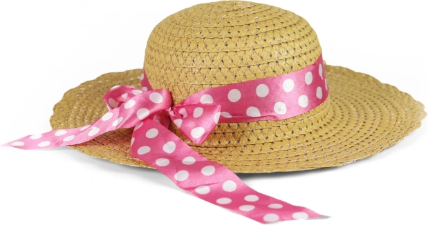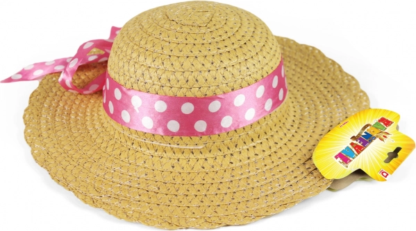 Gyönyörű gyerek szalmakalap, ideális kis divatkedvelőknek, rózsaszín szalaggal fehér pöttyökkel díszítve.