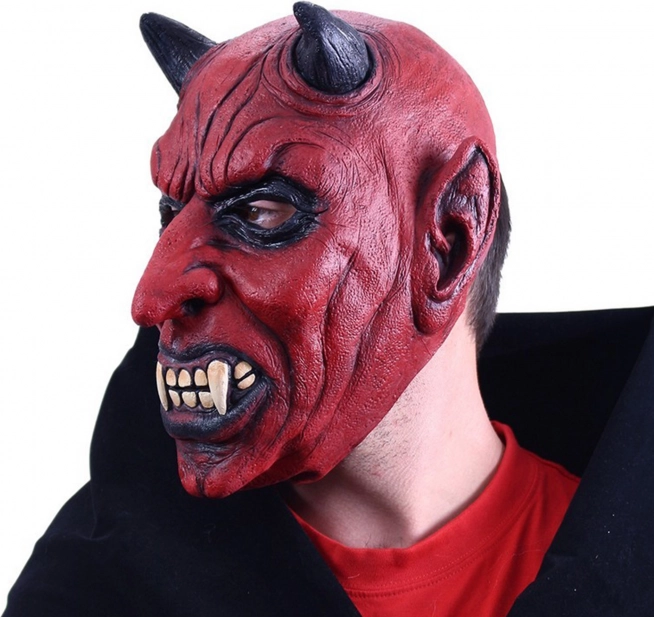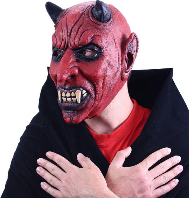 Magas részletességű latex maszk, valósághű ördögi elemekkel, beleértve a fekete szarvakat és éles fogakat, amelyek növelik a rémisztő hitelességet.