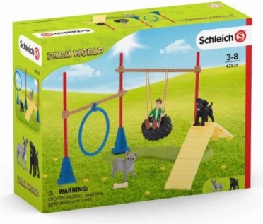 A Schleich Farm World kollekció kutyajátszótere szórakoztató ügyességi pályát kínál ugrókarikával, hintapad–pallóval és bójákkal kiegészített rúddal. A figurák realisztikus részleteinek köszönhetően a gyerek könnyen belép a farm világába, és örömteli, mozgással teli saját történeteket alkothat.