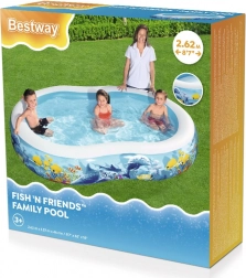 A BESTWAY Fish 'n Friends felfújható medence színes tengeralatti birodalommá varázsolja a kerted. Az ovális forma bőséges helyet ad a játékhoz és pancsoláshoz, míg a széles oldalfalak kényelmet és stabilitást biztosítanak. A minőségi PVC/vinyl jól állja a hétköznapi használatot a forró nyári napokon.