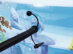 Élvezd a nyarat a tágas, óceán motívumos BESTWAY felfújható medencével. Ovális formájának, széles oldalfalainak és stabil, kamrás kialakításának köszönhetően ideális a gyerekek biztonságos vízi szórakozásához. Tartós vinylből készült, gyors leeresztést és könnyű tárolást kínál.