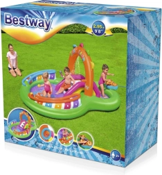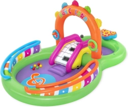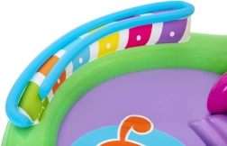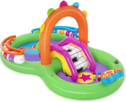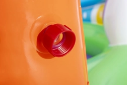 Fedezze fel és élvezze a rengeteg szórakoztató funkciót a Sing and Splash felfújható vizes játszóközponttal. A játszóközpont mikrofont és dobot tartalmaz, amelyekkel a gyerekek játszhatnak, így szabadjára engedhetik fantáziájukat. A dupla medencéket eltávolítható, kötelekkel és fülekkel rögzített csúszda köti össze. A padlóba épített felfújható párna puha landolást biztosít a csúszdáról. A beépített permetezővel ellátott ívet elég a kerti tömlőhöz csatlakoztatni. Az ív tüskéire felfújható karikákat lehet dobálni. A szett része 6 színes labda, amelyeket leengedhet az egyik vagy a másik rámpán. Ezek a játékok nemcsak szórakoztatók, hanem fejlesztik a kéz-szem koordinációt is.