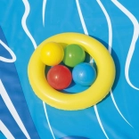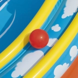 A játszóközpont színes labdákat és egy vályút is tartalmaz a gurításukhoz, amelyek támogatják a gyerekek finommotorikáját és képzeletét játék közben.