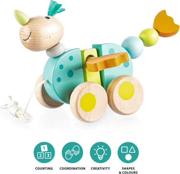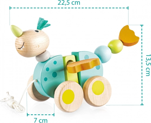 Ez a fa húzogatós, sárkány alakú játék remek társa a kis felfedezőknek. Séta közben az egyszerű mechanizmusnak köszönhetően csapkodnak a szárnyak és a farok, ami szórakoztatja a gyerekeket és ösztönzi őket a természetes mozgásra. A tartós kerekek játékos gurulást tesznek lehetővé otthon és a szabadban is.