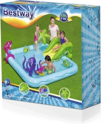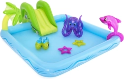 Változtasd a nyári napokat kalanddá! Ez a színes, tengeri motívumokkal díszített vízi játszótér a 2 éves kortól ajánlott gyerekek kedvence lesz – csúszda vezet a medencébe, a kerti locsolócső csatlakoztatása után permetező szökőkút működik, és egy felfújható állatka készlet serkenti a képzeletet és a mozgást.