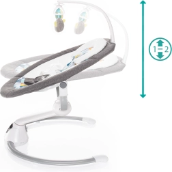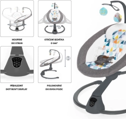 Az intuitív érintőpanel és a mellékelt távirányító kényelmes beállítást tesz lehetővé: ringatás intenzitása (5 fokozat), ringatási idő hossza (8/15/30 perc) és a melódiák hangereje. A baba mozgásának érzékelésére induló automatikus ringatás a nehezebb pillanatokban is nyugalmat biztosít. A gazdagon párnázott ülés, az 5 pontos biztonsági öv és a két levehető plüssjátékkal ellátott játékhíd a biztonságról és az örömről gondoskodik.