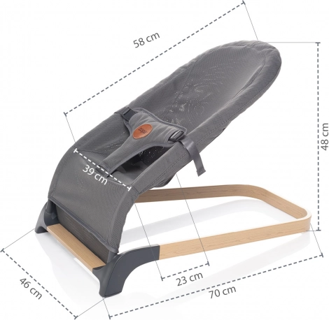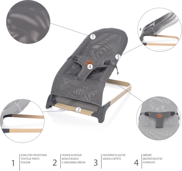 A pihenőszék könnyű és egyszerűen hordozható. Modern, fa dekorral ellátott kialakításának köszönhetően könnyedén illeszkedik bármelyik enteriőrbe. Az összeszerelés nagyon egyszerű. A pihenőszék megfelel az EN 12790 biztonsági szabványnak.