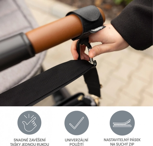 Az ellenálló fém karabiner elbírja a mindennapi terhelést, a minőségi textil szíj pedig kíméletes a babakocsi fogantyújához. A minimalista fekete dizájn bármilyen stílushoz és babakocsi-színhez illik.