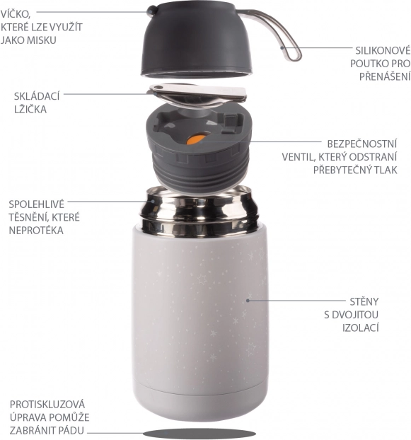 A csomag része egy okos, összecsukható kanál, amely tökéletesen illeszkedik a zárófedélbe, így bárhol meleg kását vagy levest élvezhet a gyerek. A termosz kupakja csészeként vagy tálkaként is használható. A felső záróelem biztonsági szeleppel van ellátva, amely kiengedi a nyomást okozó felesleges levegőt. A sűrített levegő kiengedésének köszönhetően a tartály könnyen nyitható, és elkerülhető az esetleges gőz általi leforrázás.