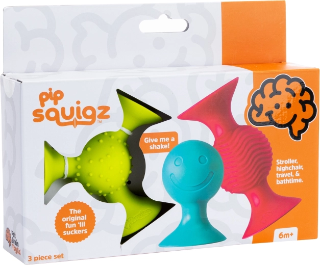 A pipSquigz (3 db) készlet végtelen játéklehetőséget kínál otthon és utazáskor. Minden elem minőségi, puha szilikonból készül, és tapadókorongokkal van ellátva, amelyek megbízhatóan tartanak a sima felületeken – az etetőszéken, a kádban vagy akár az ablakon. A csörgő és texturált elemek megfogásra és gyömöszölésre csábítanak, így természetes módon fejlesztik a motorikát és az érzékelést.