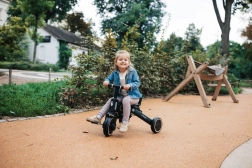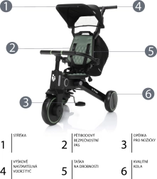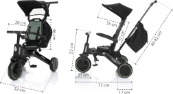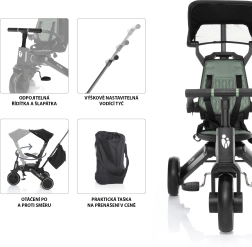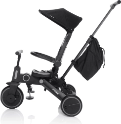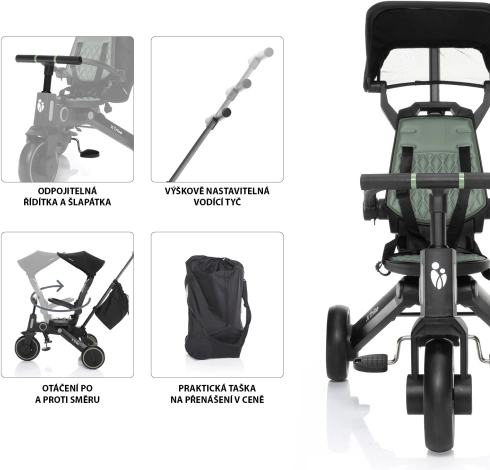Ez a háromkerekű együtt nő a gyermekkel, és könnyen alkalmazkodik a kerékpározás tanulásának különböző szakaszaihoz. A kormány deaktiválásának lehetőségével és a tolókar magasságának állításával a szülők kényelmesen irányíthatják, mint egy babakocsit, miközben a gyerekek több szabadságot és szórakozást élveznek. A párnázott ülőbetét és a háttámla levehető és könnyen tisztítható.