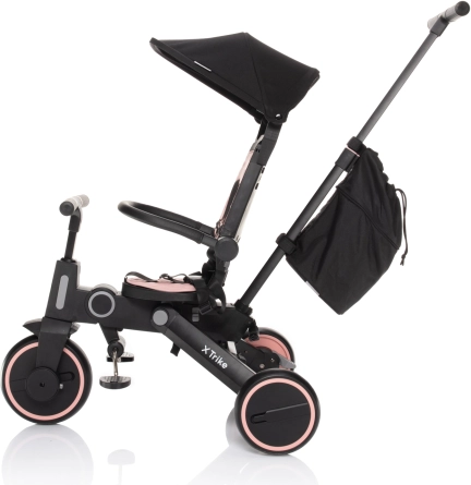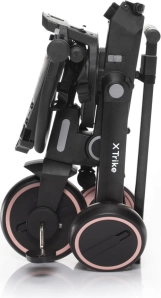 Az X Trike modellt a összecsukható váz teszi kiemelkedővé, amely nagyon kompakt méretre hajtható, így könnyen elfér az autóban vagy a szekrényben. A menetirány szerinti vagy azzal ellentétes haladás lehetőségével és a magasságban állítható tolókarral bármely kirándulás gyerekjáték. A praktikus lecsatolható táska és a csomagban található hordtáska maximalizálja a használati értéket.