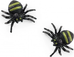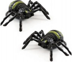 Két műanyag pók fekete testtel és zöld csíkokkal, amelyek ideálisak dekorációkhoz vagy kiegészítőként Halloweenkor.
