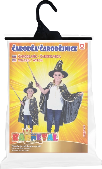 Tökéletes készlet kis varázslók számára ünnepekre! Tartalmaz egy fekete köpenyt arany szegéllyel és csillagokkal, valamint egy tökéletesen összeillő kalapot.